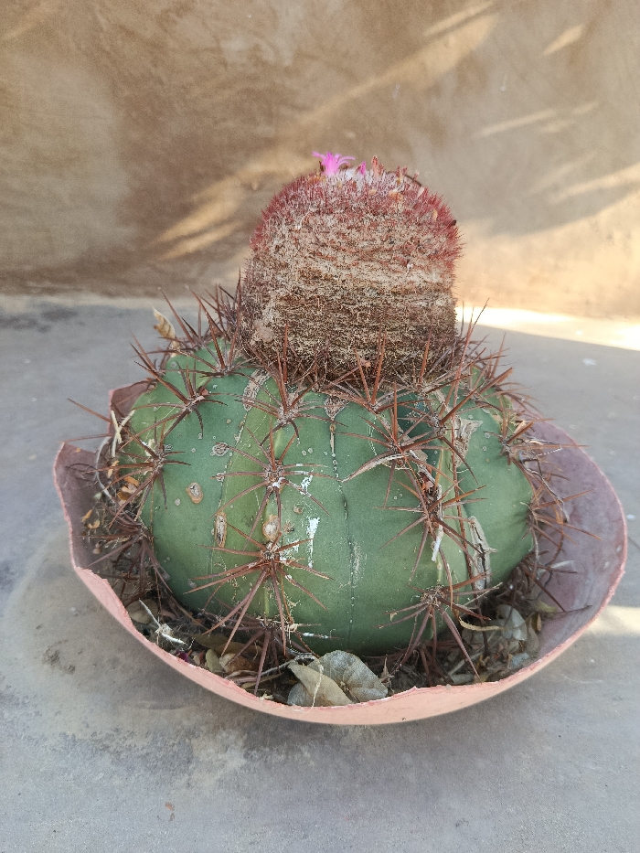 A mature cactus plant, identified as a _Melocactus_ species due to its distinct green globular body and reddish-brown cephalium, is centered in the frame. The cactus body is dark green, approximately spherical, and features prominent ribs lined with clusters of dark reddish-brown spines. The surface of the main body exhibits irregular white or light grey marks, indicative of scarring or mineral residue. A dense, cylindrical, reddish-brown cephalium, covered in fine, light-colored bristles or wool, surmounts the green body. A single small, vibrant pink flower emerges from the apex of the cephalium. The cactus is contained within a makeshift, irregularly shaped, light brown or reddish-brown plastic basin, which appears to be a cut or damaged portion of a larger container. This basin is filled with dark soil and sparse organic debris, including dried leaves, surrounding the base of the plant. The container rests on a flat, light grey, textured surface, consistent with concrete or a similar paved material. This surface shows minor discoloration and granular texture. In the background, a vertical, light brown or tan wall with a rough, uneven texture is visible. The wall is illuminated by bright light, casting a faint shadow in the upper right quadrant. The scene is outdoors, brightly lit, and depicts no human presence or activity. This scene is located in the city of Guayacancito, Venezuela.