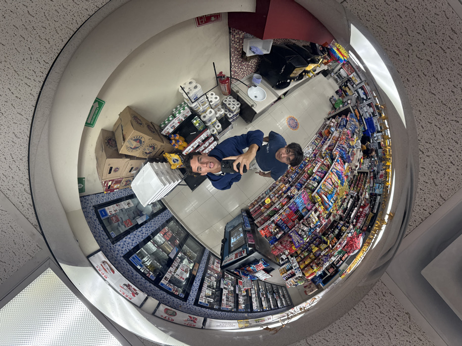 A fisheye lens captures a convenience store interior. Two men hold a phone taking a selfie. Shelves are stocked with snacks and drinks. A cooler displays various beverages. Boxes of beverages and toilet paper are stacked near the back. A sink and cleaning supplies are visible. The distorted perspective makes the store seem spherical.