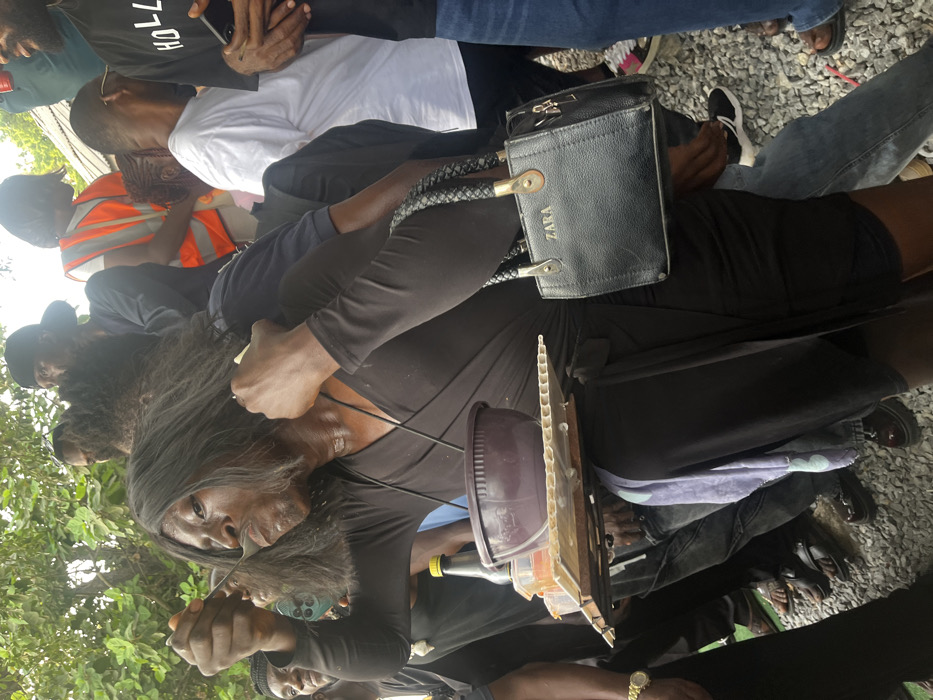 A gathering of people, partially visible, stand outdoors on gravel. One individual in focus wears a black dress and holds a small, elaborately framed object with a purple bowl attached. A "ZARA" labeled black purse rests on their lap. Attendees include someone in a white shirt with "HOLLISTER" on it, a person in an orange vest, and others in dark clothing. Some hold phones and wear watches, hinting at modern attire amongst the group.