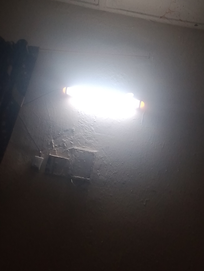 A stark image shows an illuminated fluorescent tube light fixture, seemingly attached to a roughly textured, peeling wall. The light casts a strong glare, obscuring details on the wall. Some electrical components are visible on the wall below the light. A dark object, possibly a curtain, is noticeable to the left. The upper portion of the wall appears smoother, with a ceiling line visible. The overall impression is that of a dimly lit, somewhat rundown space.