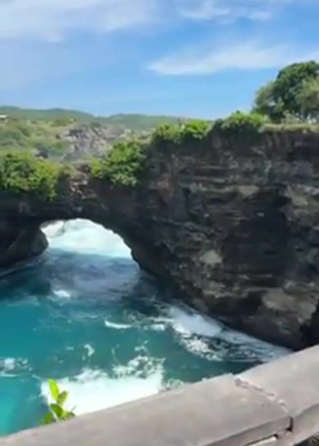 The camera pans upwards to show an arch-shaped rock formation over turquoise waters, viewed from behind a wooden railing. The arch is topped with green foliage and stands against a backdrop of a light blue sky with scattered clouds. Waves can be seen surging through the archway. The landscape visible beyond the arch is green and hilly.