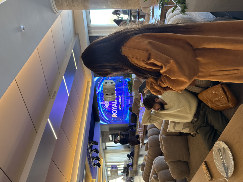 This image captures an indoor scene within a modern lounge or restaurant, identified as being in Tsakhkadzor, Armenia. In the foreground, a female individual, seen from behind, with long dark hair, wears a long, loose-fitting, light brown coat and holds a smartphone in both hands. To her left, in the midground, a bearded male individual is seated comfortably on a light brown sectional sofa, wearing a cream-colored V-neck sweater and dark trousers, with his hands clasped behind his head. An orange, textured clutch bag rests next to him on the sofa. On a light wooden table in the immediate foreground, a white fluted plate with silverware (fork and knife) and a wine glass are present, alongside a gold-toned object. In the background, a large stage is visible with an illuminated LED screen displaying the word "ROYAL" above a smaller line of text, possibly "RESORT & CASINO" or "RESTAURANT," surrounded by blue and white abstract light patterns. Stacks of professional audio speakers flank the screen. Above the stage, multiple stage lights are mounted on a truss. To the left of the stage, a male staff member in dark attire holds a serving tray. Further back, near large windows that provide natural light, several indistinct figures are scattered. The ceiling features recessed lighting and linear strip lights, some emitting a blue hue. The room is furnished with numerous modular, light brown sectional sofas and small wooden tables. A light-colored, textured pillar is visible on the right side of the frame. Green plants are incorporated into the decor on some tables.