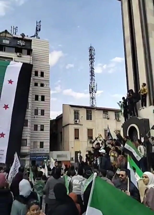 - "crowd of people gathered in a public square, many waving Syrian flags" by FM-4RDN43, licensed under CC BY 4.0