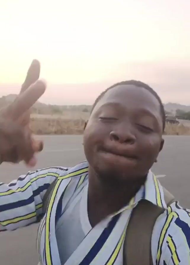 A man with dark skin and a striped shirt is recording a selfie video. He has a backpack on. He is standing on a paved road with light-colored sky in the background. In the distance, there is a vehicle. The man is making hand gestures and the audio contains a very loud roaring sound.