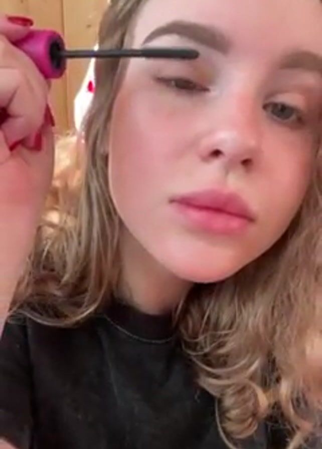 A young woman is applying mascara to her upper eyelashes. She is facing the camera directly, and the camera is positioned at eye level. She has fair skin, blonde curly hair, and light pink lips. She is wearing a dark gray shirt. The mascara wand has a bright pink handle. A wooden wall is visible in the background.