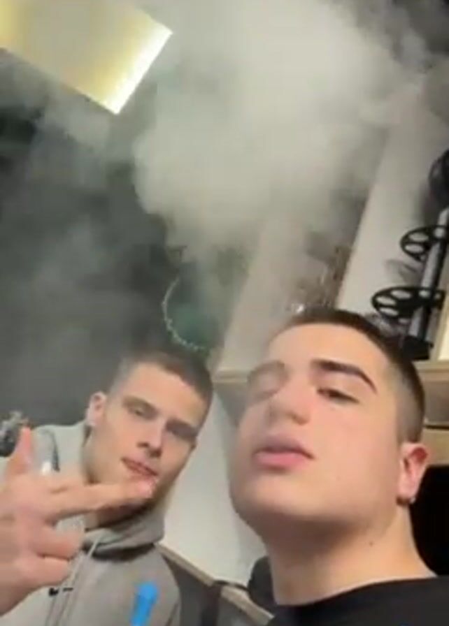 Two young men are indoors, smoking from a hookah