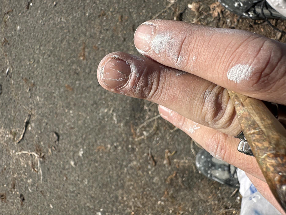 A close-up, downward-angled shot captures a person's right hand, specifically the thumb and index finger, holding a brush-like tool. The fingers and fingernails, which exhibit visible ridges, are coated with a white, powdery substance. The brush handle is made of a material with a mottled brown and tan pattern. The background is an out-of-focus, dark, granular surface consistent with asphalt or packed dirt, scattered with small organic debris such as dried leaves and twigs. Partial views of two shoes, one dark and one lighter, both speckled with the white substance, are visible in the lower corners. The scene is brightly illuminated, suggesting outdoor conditions. This scene is located in Wissous, France.