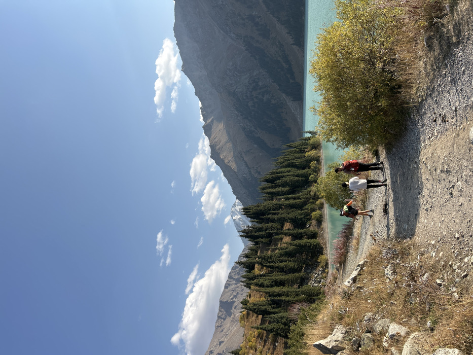 The image depicts Big Almaty Lake, situated within the Ile-Alatau National Park, south of Almaty, Kazakhstan. The scene is a mountainous landscape under a clear blue sky with scattered white cumulus clouds. In the foreground, a gravel path extends from the bottom of the frame, curving slightly to the right, along the lake's edge. Dry, straw-colored grasses and scattered rocks line the left side of this path. Three individuals are visible on the path, walking away from the camera. The leftmost person wears an orange/yellow long-sleeved top, dark pants, and a backpack, bending forward as if examining the ground or adjusting equipment. The central person wears a white long-sleeved shirt and dark pants. The rightmost person wears a red jacket and dark pants, carrying a red backpack. To the right of the path, a large bush with bright yellow autumnal foliage partially obscures the lake. The midground features the turquoise water of Big Almaty Lake, reflecting the blue sky. A dense forest of tall, dark green coniferous trees (pines or firs) lines the left bank of the lake, extending up a hillside where patches of yellow and orange deciduous foliage are visible. The background is dominated by rugged, imposing mountains with bare rock faces and some forested slopes. A prominent snow-capped peak is visible in the distance towards the center-left. The sunlight is bright, indicating a clear day.