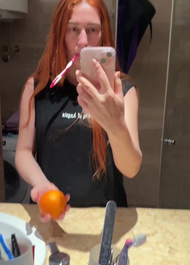 In a bathroom setting, a young woman with long red hair stands facing a mirror. She is wearing a black sleeveless shirt. In her left hand, she juggles an orange. In her mouth, she holds a pink toothbrush, and in her right hand, she holds a smartphone, presumably recording herself. The bathroom features a beige marble countertop with various items like brushes, a nail file, and small containers. Behind her, there's a washing machine to the left, a hot water heater on the wall and a tiled wall to the right. An umbrella hangs on the wall, behind her. The lighting in the bathroom is bright, enhancing the visibility of the objects and the woman's actions.
