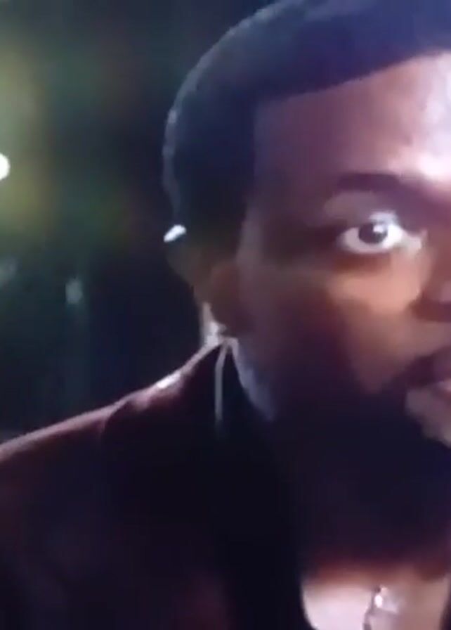 A man with dark skin, a trimmed beard, and a brown jacket looks at the camera with a surprised expression