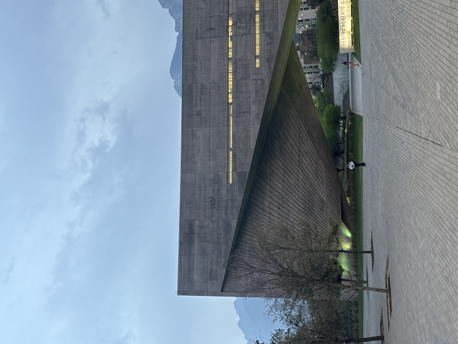 The image depicts the exterior of the Centro Roberto Garza Sada (CRGS) at the University of Monterrey (UDEM) in Monterrey, Mexico