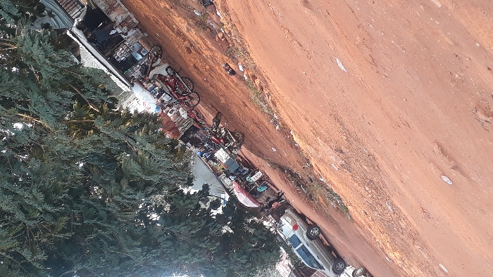 A rural dirt road sits adjacent to a property with a building partially visible behind lush evergreen trees. Various items, including several bicycles and what appears to be a motorcycle, are scattered along the side of the road. An SUV is parked near the edge of the road, close to the property line. Debris is dispersed along the road. The composition suggests a cluttered roadside environment.