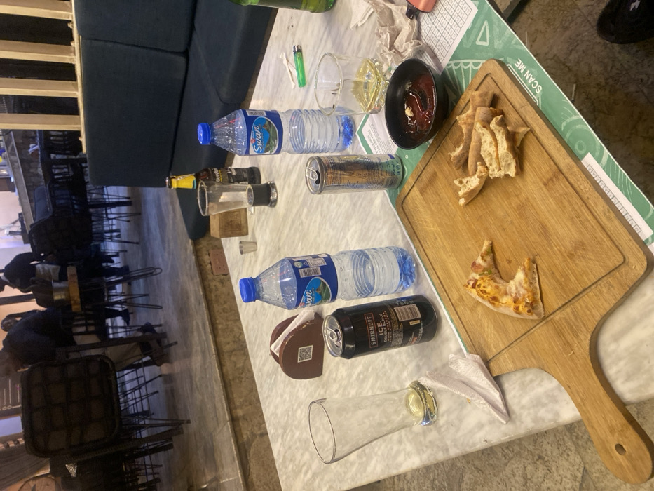 A table is littered with remnants of a gathering. There are two water bottles, two empty cans, a beer bottle, a lighter, and two empty glasses. A small bowl contains a red sauce. On a wooden cutting board are remnants of a pizza, including crusts and a lone slice. A napkin holder sits nearby. In the background are dark chairs and tables in what appears to be a restaurant.