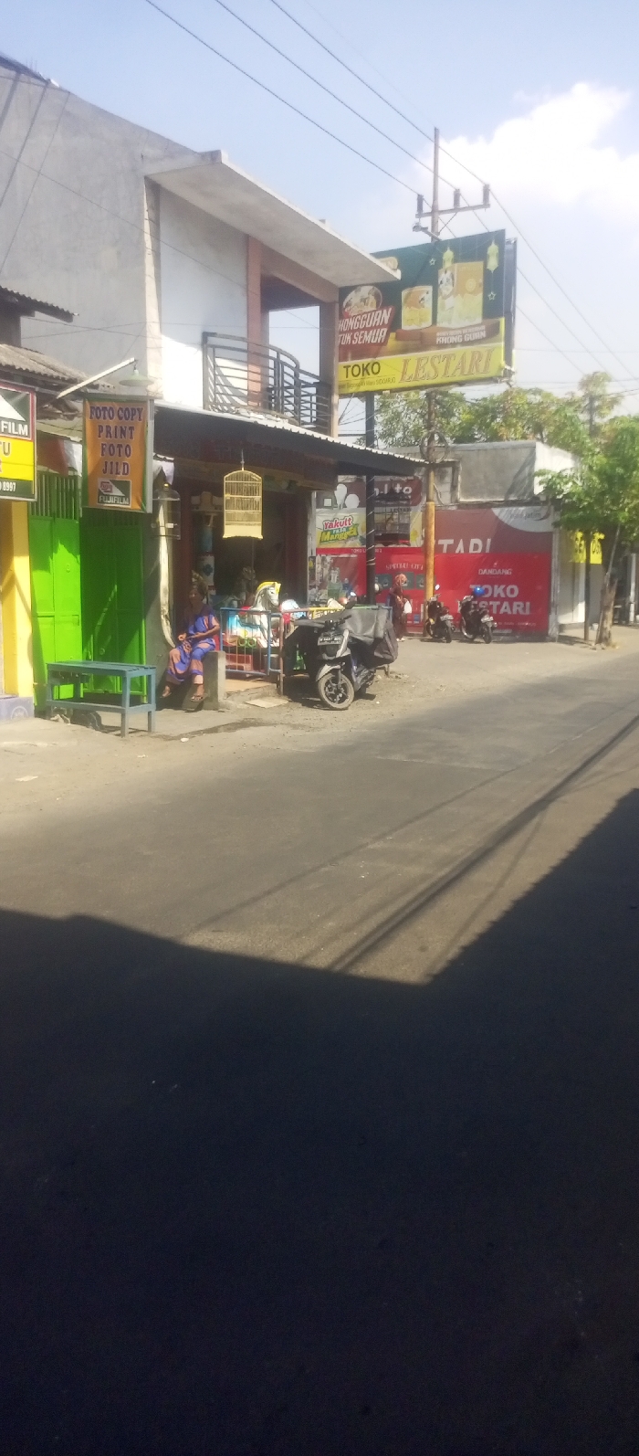The image displays a daytime street scene in Kepuh Kiriman, Indonesia, characterized by commercial buildings, parked motor vehicles, and pedestrians under a clear sky. The environment features a paved asphalt road in the foreground, partially covered by dark shadows cast from the left. Overhead utility lines are visible across the upper portion of the sky, supported by a utility pole in the midground. To the far right, green tree foliage is visible. On the left, a two-story building has a ground-level storefront with a corrugated metal awning. The storefront displays a green metal gate and a yellow wall section. A white sign with red and blue text, advertising "FOTO COPY," "PRINT," "FOTO," and "JILD" (binding) with a Fujifilm logo, is affixed to the entrance. A light green wooden bench is positioned on the sidewalk in front of this shop. Inside the open shop entrance, a person wearing a blue patterned garment is seated on a low stool, facing outwards. Two traditional wooden bird cages are suspended from the awning structure. Various items, including a children's ride, are visible inside the shop. A black motor scooter with a large rear delivery box, license plate M 5447 QAX, is parked in front of this shop. Further to the right, a multi-story building features a prominent red-painted ground floor facade marked "TOKO LESTARI" and "DANDANG." A billboard above this building advertises "HONGGUAN TUK SEMUA" and "TOKO LESTARI," displaying images of food products. Multiple motor scooters are parked in front of Toko Lestari. At least two individuals are visible near the entrance of Toko Lestari; one individual wearing a headscarf is partially obscured. Another sign advertising "Yakult" is visible near the Toko Lestari entrance.