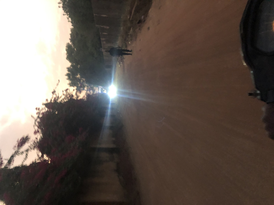 A dimly lit outdoor scene shows a dirt road stretching into the distance. A person walks along the road, illuminated by a bright light that casts long rays. Trees and vegetation line the left side of the road, while a wall runs along the right. A blurry object, possibly a vehicle part, is visible in the lower right corner of the frame. The sky appears overcast, contributing to the overall low light level.