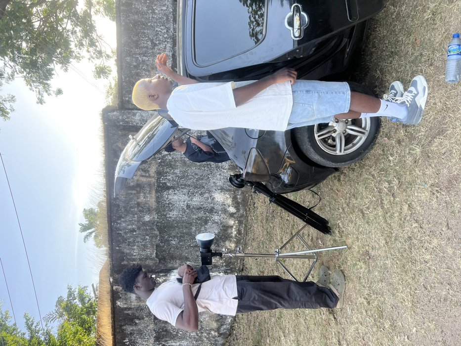 The image captures an outdoor scene in an unspecified area of Jos, Nigeria, during daylight. Three males are visible in the foreground with a black four-door car and photography equipment. On the left, a dark-skinned male with short, dark curly hair, dressed in a light-colored short-sleeved t-shirt, dark trousers, and light green crocs, stands adjusting a small dark object in his hands. A black shoulder bag is worn across his body. Adjacent to him is a silver tripod light stand holding a photography strobe light with a reflector. Towards the center, partially obscured by the black car's open trunk lid, a second dark-skinned male with dark hair, wearing a dark t-shirt, is seen leaning into the vehicle's trunk. The black car has its rear passenger door ajar and its trunk lid fully open. A black, collapsed light stand or tripod is leaning against the car's rear bumper, near the right-side tire. On the right, a dark-skinned male with distinctive dyed blonde hair, dressed in an oversized white t-shirt, light blue denim shorts, white socks, and grey and white sneakers, stands facing left, positioned next to the black car's open rear passenger door. His right hand is near the car's window frame. The ground consists of sparse, dry yellowish-brown grass and patches of bare soil. A clear plastic water bottle with a blue label lies on its side in the lower right corner. The background features a weathered, light-colored concrete wall topped with green trees and foliage, beneath a bright sky. The scene is brightly illuminated, indicating direct sunlight from the right.