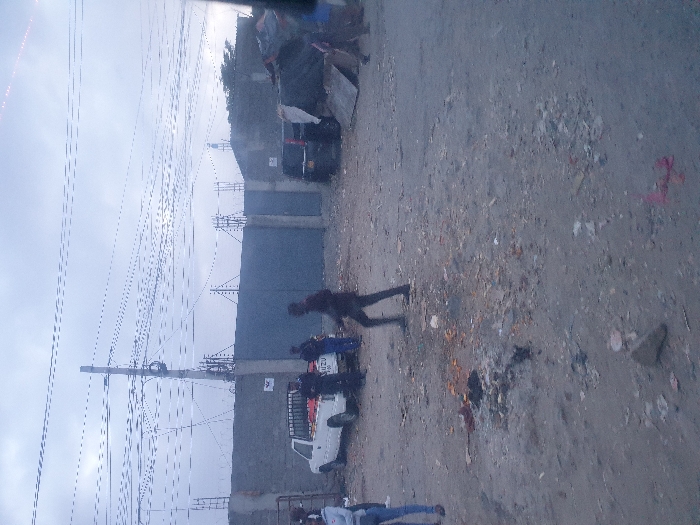 A sideways shot captures an urban scene with a street littered with trash. Several people are visible, some standing near a white vehicle with blue markings. A darker vehicle is parked further down the street next to a tall gray wall. Above, numerous power lines crisscross against a cloudy sky. The ground is unpaved and covered with debris.