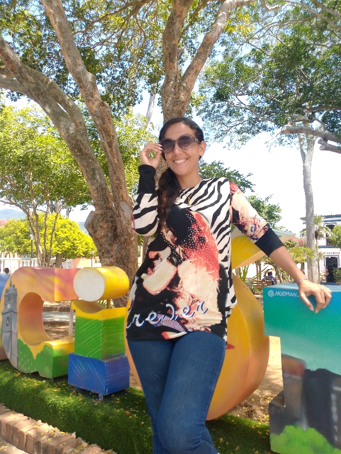 A female subject, appearing to be in her twenties or thirties, with dark, wavy hair and wearing large, dark-framed sunglasses, stands smiling directly at the camera. She is dressed in a long-sleeved shirt featuring a black and white zebra print on the upper portion and a multi-colored graphic design with red, black, and white elements on the torso, paired with blue jeans. Her right hand is raised, touching the temple of her sunglasses, while her left hand rests on a large, colorful, three-dimensional letter-like structure. The scene is set in Plaza Bolívar, La Asunción, Venezuela, confirmed by the presence of the distinct "LA ASUNCION" monument, of which a multi-colored 'G' shape and other abstract letter segments are visible in the foreground, situated on artificial green turf. A prominent tree with light-colored bark and green foliage occupies the midground behind the subject. The background reveals colonial-style architecture, including a building with an "ARTESANÍAS" (Crafts) sign on the right, and distant green mountains under a bright, clear sky. Another individual is visible seated on a bench in the far right background. The area is brightly illuminated by natural daylight.