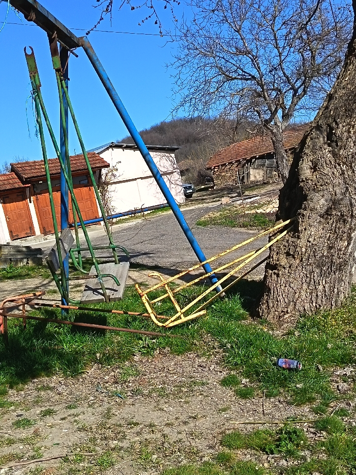 The image depicts an outdoor scene in Draganovo, Bulgaria, under a clear blue sky. In the foreground, a metal swing set with blue angled support posts and a horizontal crossbar is situated on ground composed of dirt and sparse green grass. Two green metal swing frames are suspended from the crossbar; one features a wooden seat, while the other is empty. A detached yellow metal frame rests on the ground to the right, leaning against the thick, textured trunk of a large, bare-branched tree. A rusty horizontal metal bar lies on the ground in front of the swing seats. Behind the swing set, to the left, are three small, light-colored structures with reddish-brown tiled roofs and wooden doors. Further back, a larger, light-colored building with a flat roof is visible. A dark-colored vehicle is parked on a dirt path between this building and an older wooden building with a reddish-brown tiled roof, located further uphill to the right. The background features hills covered with bare trees and brush. A single, crushed beverage can with blue and red markings lies on the grass near the base of the large tree. No people are visible in the scene.