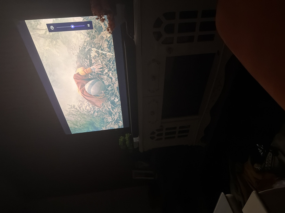 This image depicts a dimly lit indoor environment in Ogbomosho, Nigeria, viewed from a seated perspective. A large flat-screen television dominates the center, displaying a scene where a figure, clad in a red/orange hooded garment and yellow undershirt, lies face down amidst a dense layer of dry leaves or forest debris. The figure's head is covered by a light-colored, possibly striped, cap, and one arm is extended forward. The background of the displayed scene features sparse vegetation and a hazy sky. A transparent, vertical volume slider with a speaker icon and the number '44' is overlaid on the right side of the television screen. The television is positioned atop a white, ornate media console or cabinet, characterized by decorative arched paneling on its front. Directly below the screen, a black soundbar is present. To the left of the television, on the console, a small green potted plant sits. A reddish decorative object, possibly a dried plant arrangement, is partially visible on the console to the right of the television. The room's walls are dark, and a faint outline of an object, possibly a framed item, is visible on the far left wall. In the bottom right foreground, a portion of an orange or red upholstered surface, likely a seat cushion or armrest, is visible.