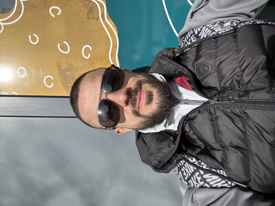 An image depicts a male individual centered in a selfie-style shot, taken outdoors in what is identified as Garmisch-Partenkirchen, Germany, though the specific location within the city is not visually discernible. The man has short, dark, buzzed hair and a full, dark beard. He is wearing dark aviator-style sunglasses, with the "Porsche Design" brand visible on the right temple arm. Reflections in the sunglass lenses show indistinct urban architecture and sky. He exhibits a slight smile. He is dressed in layered clothing: a light grey or white zippered top, possibly a fleece, under a black puffer vest with a dark red lining visible at the collar. A black patch featuring a shield emblem and the text "DANGER D.G" is present on the left chest of the vest. Over his left shoulder, a grey long-sleeved garment is visible, along with a portion of a backpack strap that displays a black and white repeating text pattern, possibly "NIKE". The background consists of a vertical wall or panel structure. To the left, a plain grey surface shows reflections of clouds or sunlight. To the right, a multi-colored decorative panel is visible. The upper right section features a mustard yellow or light brown color with scattered white stylized 'C' shapes. The lower right section is teal or turquoise, separated from the yellow/brown by a white wavy line, suggestive of a large outlined shape. The scene is illuminated by strong sunlight, casting visible highlights on the man's face and clothing.