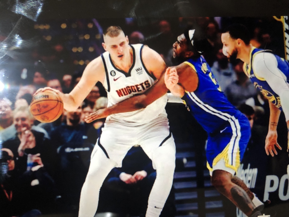 The image, rotated 90 degrees counter-clockwise, depicts an indoor basketball game in progress within the city of Kafr Sousa Municipality, Syria. In the upper central portion, a fair-skinned male player, wearing a white sleeveless jersey with "NUGGETS" text and the number "6" visible, is airborne. He holds a Wilson brand basketball aloft in his extended right hand, positioned above his head. His left arm is extended downwards and bent at the elbow, making contact with an opposing player. This opposing player, a dark-skinned male in a blue and yellow sleeveless jersey and shorts, is looking upwards, his left arm extended and appearing to grapple or defend against the first player's arm. In the lower right background, a third male player, also dark-skinned and wearing a blue and yellow jersey, with a visible beard, is looking upwards towards the main action. The background consists of a blurred arena environment with indistinct spectators and artificial lighting, characteristic of a professional sports venue.