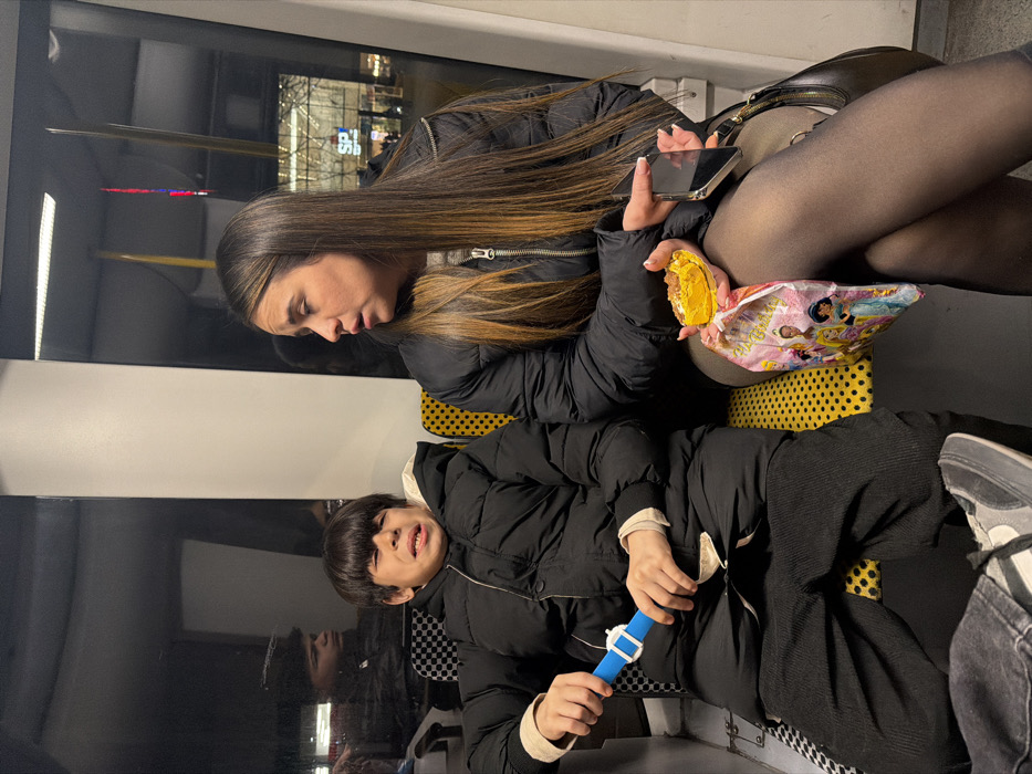 In a public transport setting, a woman sits with crossed legs in black tights, holding a phone and a partially eaten snack in a Disney-themed wrapper. She wears a dark puffer jacket and has long, highlighted hair. Beside her, a child in a similar puffer jacket is also seated, playing with a blue plastic toy resembling a watch. The seat has yellow polka dots on it, and reflections can be seen in the window behind them.