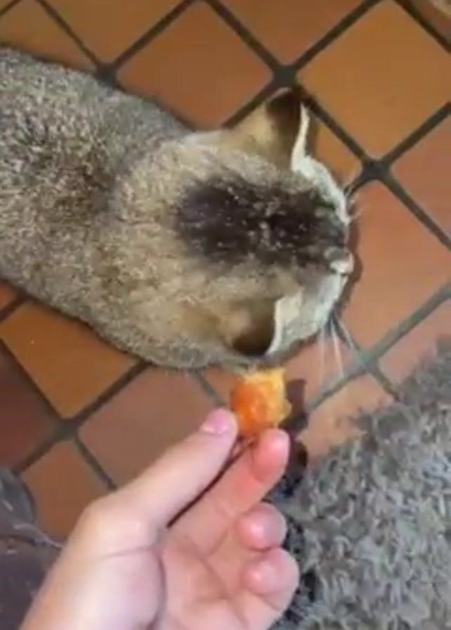 - "Here's a detailed description of the video: A person's hand holds a small, cooked piece of meat (possibly chicken or another poultry) in front of a domestic cat" by FM-RVx413, licensed under CC BY 4.0