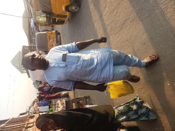 This image depicts a bustling street scene in Suleja, Nigeria, under bright natural lighting that casts distinct shadows. In the foreground, an adult male, with dark skin and a short haircut, walks towards the viewer's right while looking directly at the camera. He wears a light blue traditional tunic with short sleeves and matching trousers, along with brown leather sandals. A black smartphone is visible in his left shirt pocket, and he carries a yellow plastic bag in his left hand. To the left of the central male figure, a young female, partially obscured, is visible from the waist up. She wears a black hijab and a patterned skirt with green, blue, and white abstract designs. She also looks towards the camera, standing next to a market stall displaying small, light-colored items, possibly food. The mid-ground and background feature a busy street lined with market stalls on the left, displaying various goods. Numerous individuals, mostly women wearing head coverings, can be seen walking and interacting within the market environment. Two yellow motorized tricycles (tuk-tuks) are present on the paved road; one is partially visible behind the central figure, and another to the right has the number "749" on its side. A large white truck is also visible further down the street. Buildings with light-colored walls and dark roofs line the background, including one prominent structure with a white, tiered, dome-like feature on its roof. The road surface is a light greyish-brown, indicating a paved street.
