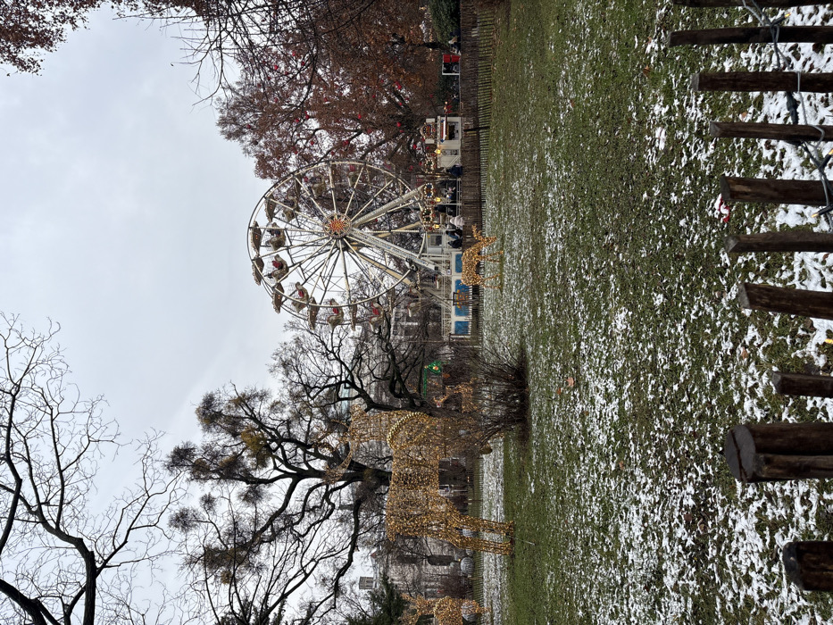 This image depicts a winter scene within the Rathauspark area of Vienna, Austria, specifically featuring elements consistent with the Wiener Christkindlmarkt. The overhead sky is overcast and light grey. In the foreground, a green grass lawn is sparsely covered with patches of thin snow and scattered dark organic debris. A low wooden fence with several dark, vertical posts is partially visible along the bottom right edge. The midground features multiple light-sculpture deer figures, illuminated with warm gold lights. A large standing deer is positioned on the left, and a smaller deer, appearing to graze, is on the right. Additional partial deer figures are visible further left. A dense, leafless shrub is centrally located. A wooden picket fence, composed of vertical posts, separates this park area from the activity zone beyond. In the background, a medium-sized Ferris wheel dominates the right side of the frame, featuring white structural elements, radial spokes, and multiple enclosed gondolas, some visibly occupied. Its central hub displays an orange-red light configuration. Directly behind the picket fence and extending towards the Ferris wheel are several temporary market stalls or booths, adorned with string lights and wreaths. Approximately ten to fifteen individuals, dressed in winter clothing, are visible standing or walking near these stalls and the base of the Ferris wheel. Other illuminated structures, including a blue-colored base and a green glowing object, are present within the market area. The scene is framed by numerous bare deciduous trees with dark, intricate branches, some notably bearing clusters of mistletoe. On the far left, partially obscured by tree branches, a multi-story classical-style white building with windows and a dark roofline is indistinctly visible.