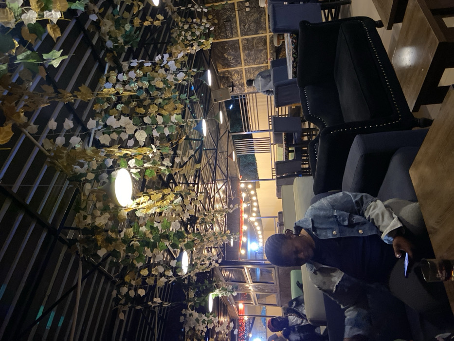 An outdoor cafe scene unfolds at night. Strings of lights and artificial foliage decorate the overhead metal structure. Modern, dark-blue furniture, including chairs and sofas, provides seating. A person in a denim jacket sits on a sofa, looking at a phone. Other patrons are visible in the background. A glass sits on a wooden table in the foreground.