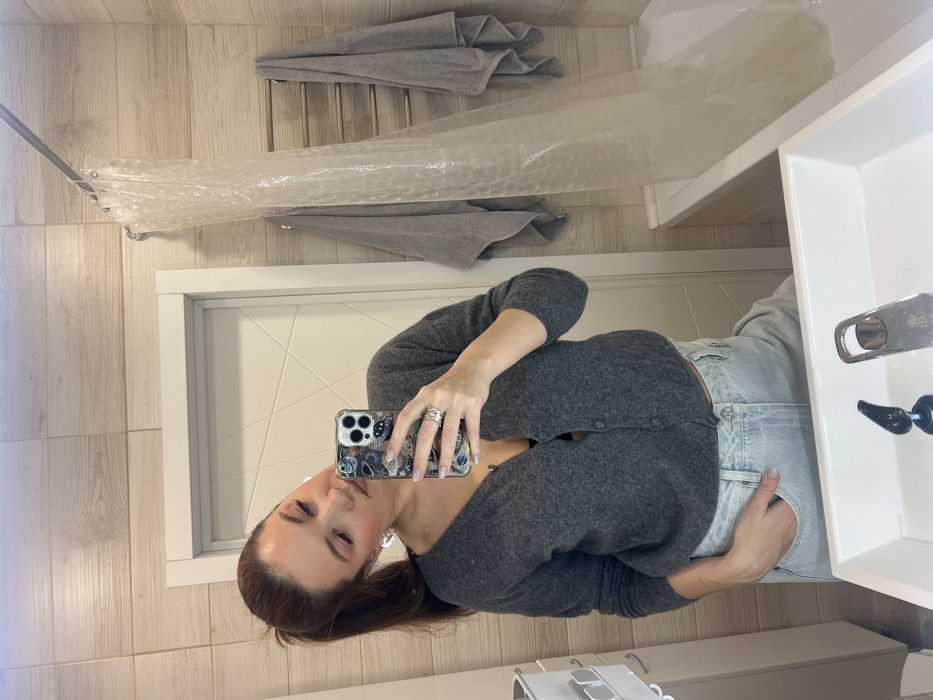 A woman stands in a bathroom, taking a mirror selfie with her phone. She is wearing a grey cardigan and light-wash jeans. The bathroom features wood-look tile, a white door with a geometric pattern, a shower curtain, and a grey towel rack. The sink is white with a silver faucet. The woman has brown hair pulled back into a ponytail.