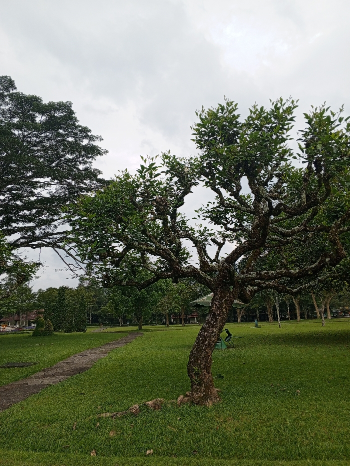 A lush green park scene unfolds under a cloudy sky. A winding stone path leads into the landscape. A large tree with gnarled branches dominates the right foreground, its leaves reaching towards the sky. To the left, a second expansive tree adds depth. A person sits under a small pavilion structure further in the distance, surrounded by other trees, creating a tranquil, nature-filled ambiance.