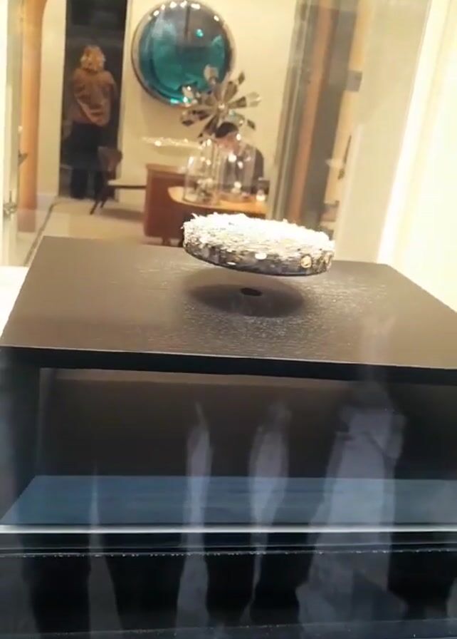 shiny, decorative disk levitating above a black surface, likely a display case. The disk appears to be made of many small, light-colored objects. Behind the display case, a storefront is visible with "MB&F" branding. There are people visible in the store. The camera is relatively still, focusing on the levitating disk. There is a brief audio snippet of two people speaking, mentioning "15,000 euros" and commenting on whether the object will still float when taken home.