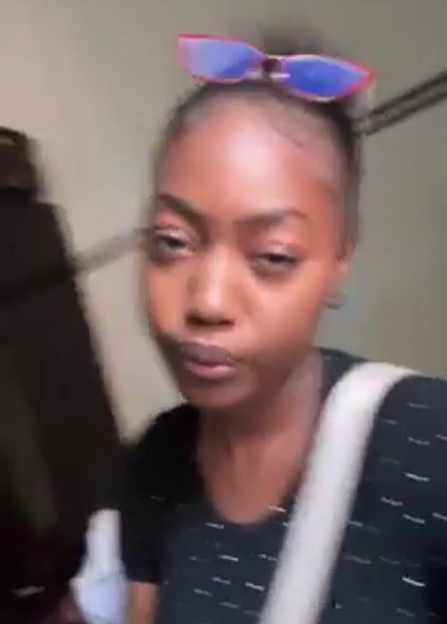 young woman with brown skin. Her hair is pulled back into a small bun and she has red framed sunglasses perched on top of her head. She is wearing a black t-shirt with small silver dots and a white Louis Vuitton shoulder bag strap is visible across her chest. She appears to be indoors, standing in front of a white wall. Behind her is a dark piece of furniture, and a bed with white sheets. The woman looks directly at the camera with a neutral expression. She purses her lips briefly.