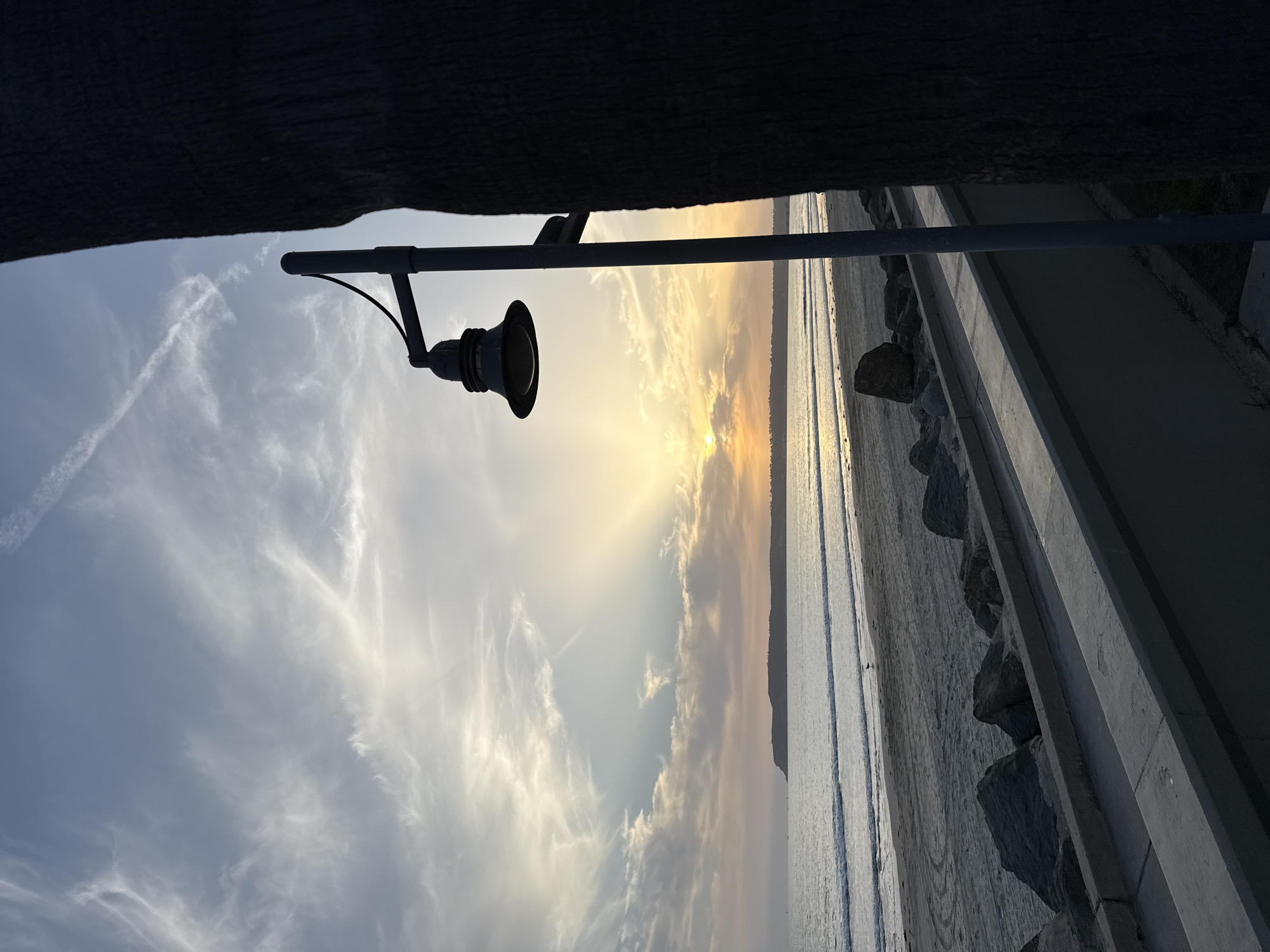 Here is a description of the image: The image shows an outdoor scene, likely a beach or coastal area. In the foreground, there's a silhouetted street lamp attached to a pole. The background features a beach with the ocean, and a sky filled with light clouds and a partially obscured sun. A concrete wall or structure runs along the side of the image, with rocks at its base. Based on the coastal setting and the style of the street lamp, the location may be the city of Coronado, United States of America.