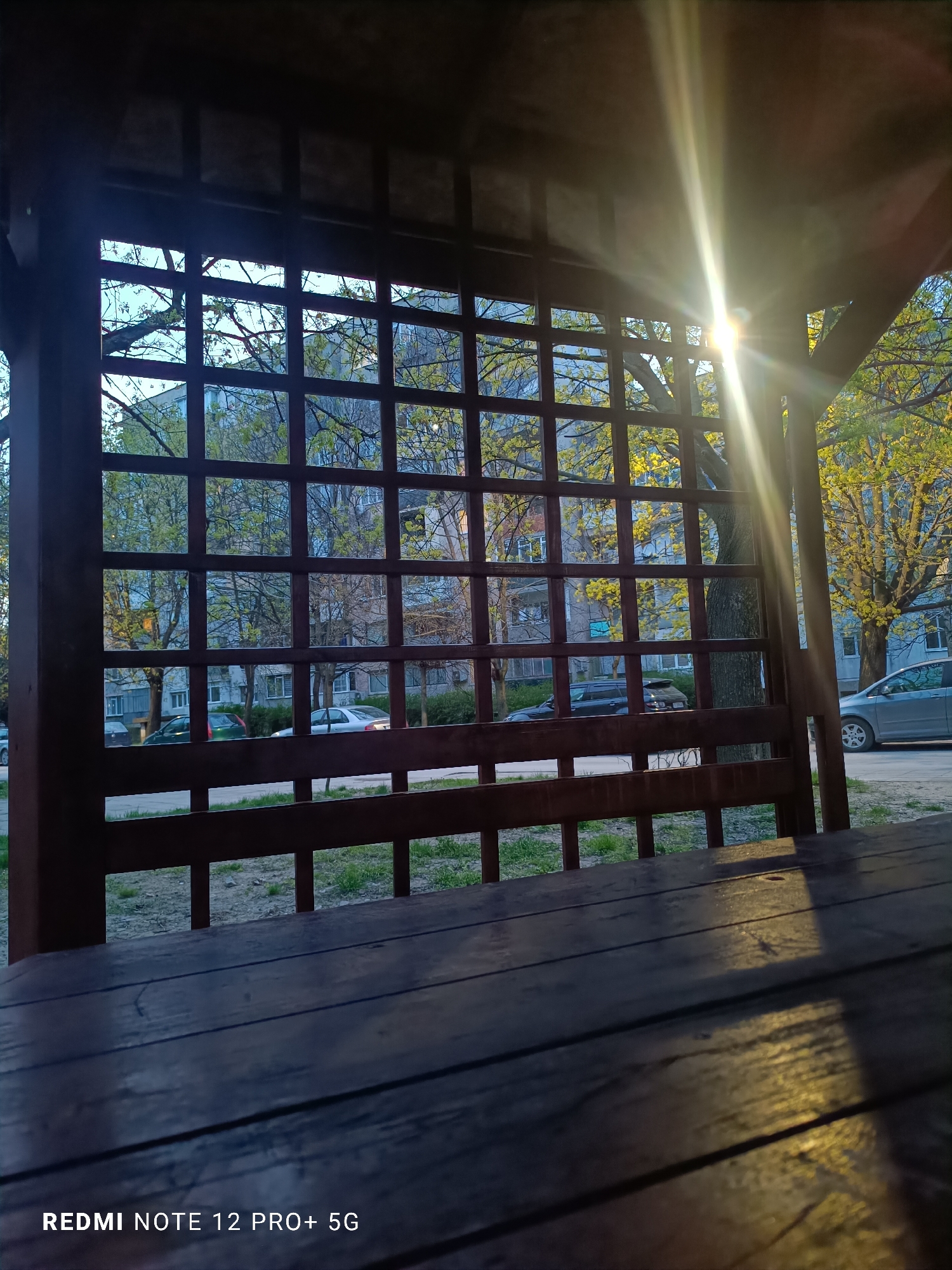 The photograph depicts a view from inside a wooden gazebo-like structure. The foreground shows a wooden table surface with dark shadows. Through a latticework wall, a street scene is visible with apartment buildings, trees with early spring foliage, and parked cars. The sunlight is harsh, creating a strong glare in the upper right portion of the frame. The camera, identified as a Redmi Note 12 Pro+ 5G, has left a watermark at the bottom left of the image. The location is Targovishte, Bulgaria. There are no people visible in the photograph.