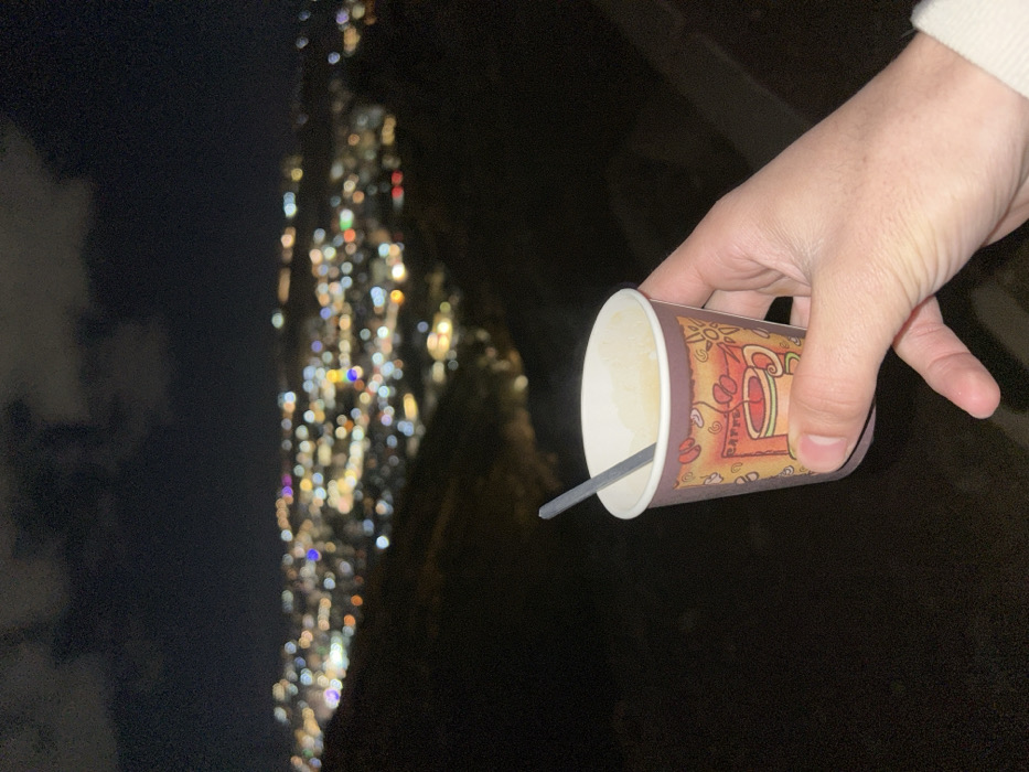 The image displays a nighttime scene from an elevated perspective overlooking Dummar Municipality, Syria. In the foreground, a light-skinned human hand, partially clad in a light-colored long-sleeved garment, holds a disposable paper cup. The cup is decorated with a brown-orange pattern depicting coffee beans, a sun, and a stylized mug, with the word "CAFFÈ" partially visible. A dark grey stirring stick is inserted into the light-brown liquid contained within the cup. The background shows a sprawling city at night, rendered in bokeh, with numerous blurred lights of various colors (white, yellow, blue, red) illuminating the dark terrain of what appears to be a valley or hilly area. The sky above the cityscape is dark, with faint, indistinct cloud formations.
