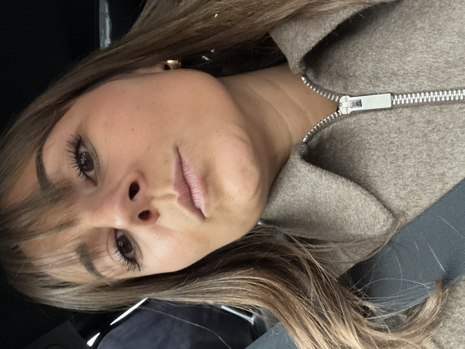 The image displays a close-up, angled portrait of a female individual positioned within a vehicle, located in Nice, France. The subject has long, light brown hair styled with bangs across her forehead, brown eyes with prominent eyelashes, and a neutral facial expression with closed, light pink lips. A small reddish mark is visible on her left nostril. She is wearing a light brown, collared woolen jacket with a visible silver zipper pull and teeth. A single gold-colored hoop earring is present on her right ear. A dark gray seatbelt is fastened across her left shoulder and chest. The background is dark and out of focus, consistent with the interior of a vehicle.