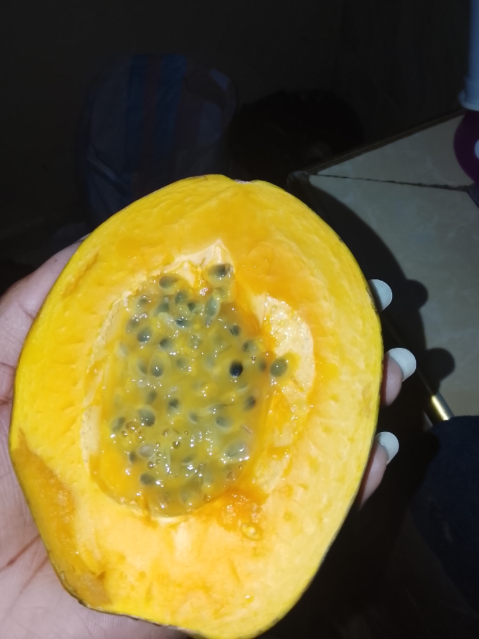 A halved ripe papaya is held in someone's hand. The fruit's skin is yellowish-orange, and the flesh is a vibrant orange. The center is filled with numerous small, black seeds embedded in a jelly-like substance. The person holding the papaya has manicured nails. The background is dimly lit and blurry, showing furniture and a curtain. The papaya's textures, from the smooth skin to the seedy interior, are apparent.