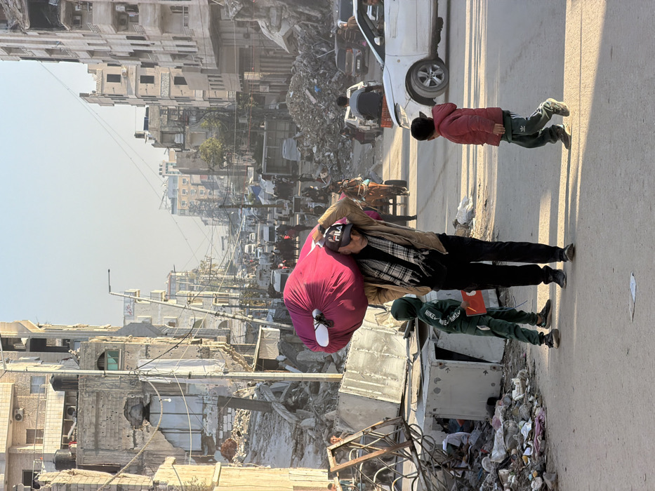 The image depicts a street scene in the city of Gaza, Palestinian Territory, characterized by extensive structural damage and debris under clear daylight