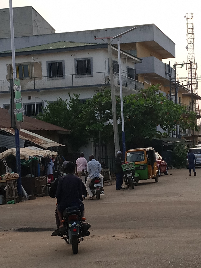 The image depicts a street scene in Sardauna, Nigeria, under daylight conditions, likely late afternoon or early morning