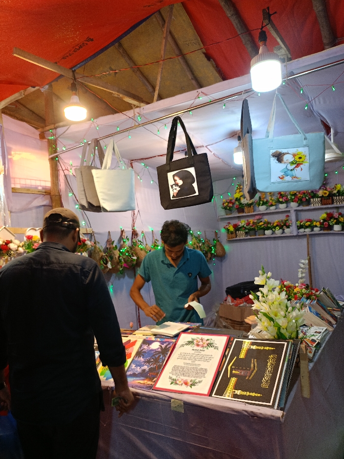 man standing at a stall, which appears to be in a market or fair in Bhola, Bangladesh, situated at the coordinates 22.69, 90.642. The stall is located inside a temporary structure, with a red corrugated metal roof and bamboo walls. There are string lights and light bulbs hanging from the ceiling, illuminating the space. Two other men are present, one standing near the stall and another standing at the back of the image. The stall is decorated with artificial flowers and other items for sale, including a variety of tote bags. There are also a number of postcards, books, and other items stacked on a table in front of the stall. The man at the stall is wearing a blue t-shirt and is holding a notebook in his left hand. The man standing near the stall is wearing a black t-shirt and is looking at the tote bags. The environment is busy and crowded, likely with shoppers and vendors at the market. The image captures a moment of activity and exchange in the bustling market of Bhola, Bangladesh.