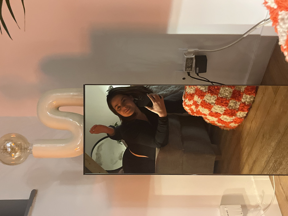 A mirror reflects a woman in black athleisure wear taking a selfie. Behind her is a bed with an orange and white checkered throw blanket, a gray couch, and a circular mirror. A white wall is behind the mirror, adorned with an "S"-shaped lamp with a visible bulb, a plant leaf, and a power outlet with a black adapter. The floor is made of wood.