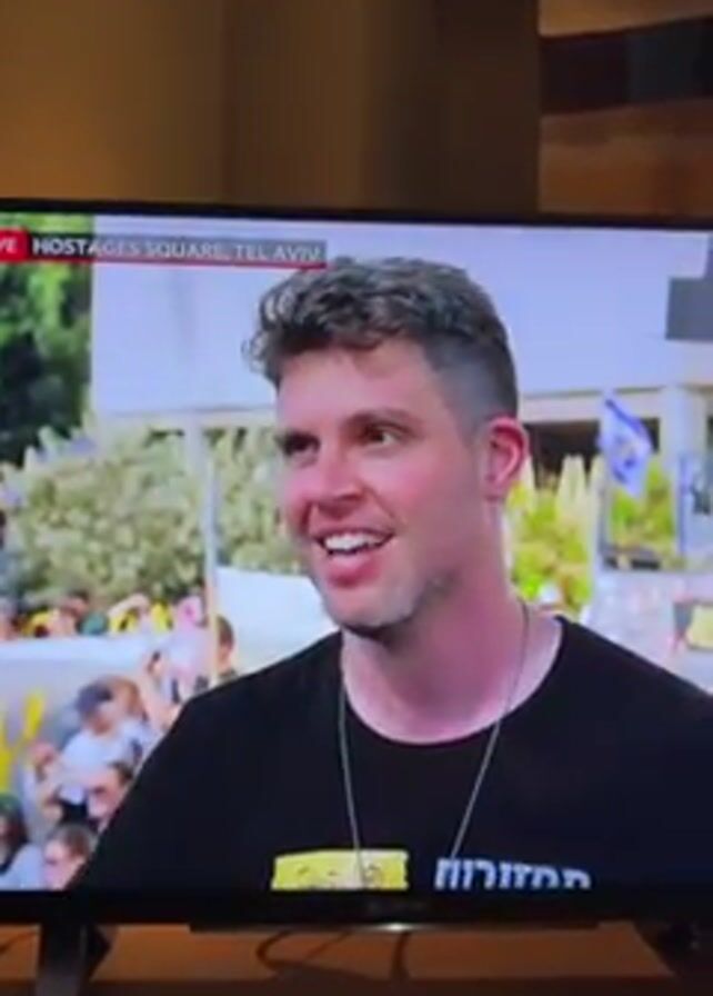 man being interviewed on television. The interview is taking place live from Hostages Square in Tel Aviv. The man is wearing a black t-shirt with white text on it and a silver necklace. He has short, curly hair. In the background, there is a large crowd of people holding flags. The interviewer is a Black man wearing a dark blue shirt. He is holding a piece of paper and a pen. The interview seems to be taking place outdoors in a public space. The TV on which the interview is being shown is resting on a wooden stand.