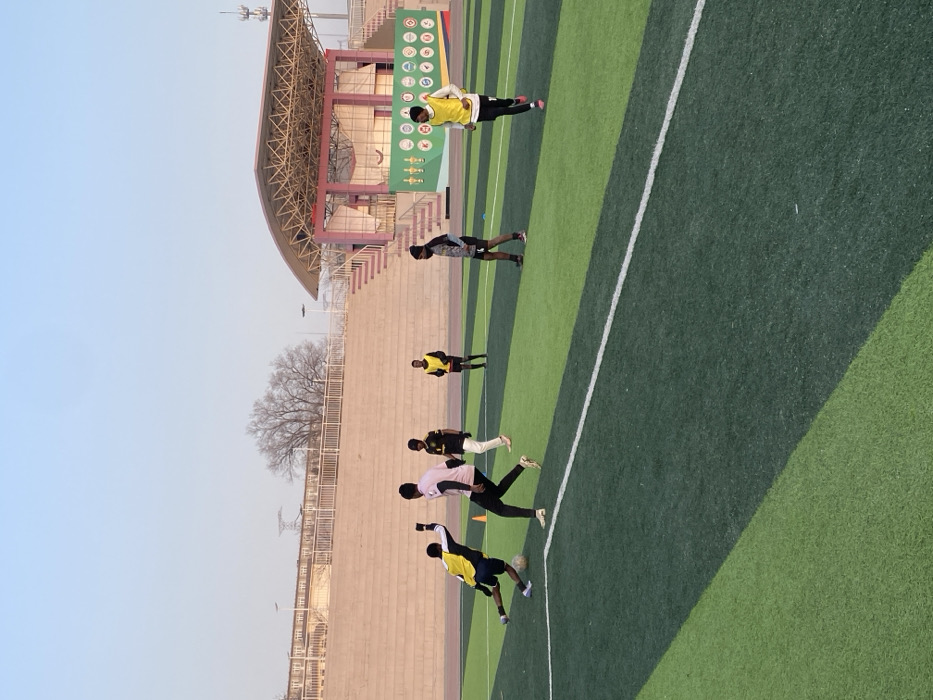 This image captures an outdoor soccer training session or casual game at a stadium in Linghe, China