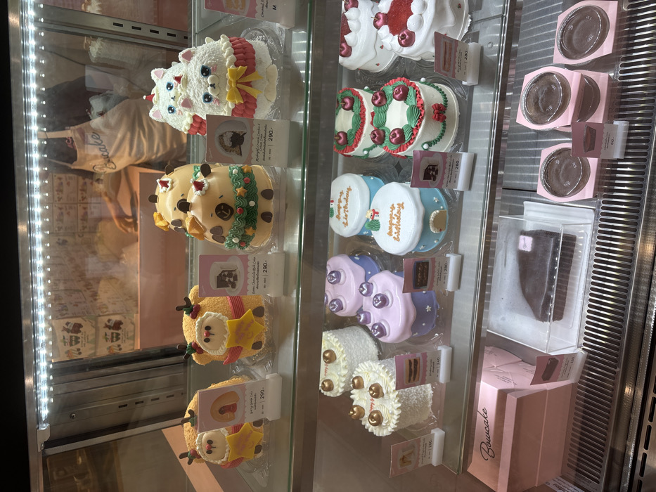 The image depicts a refrigerated multi-tiered bakery display case within a Bowcake establishment in Bangkok, Thailand