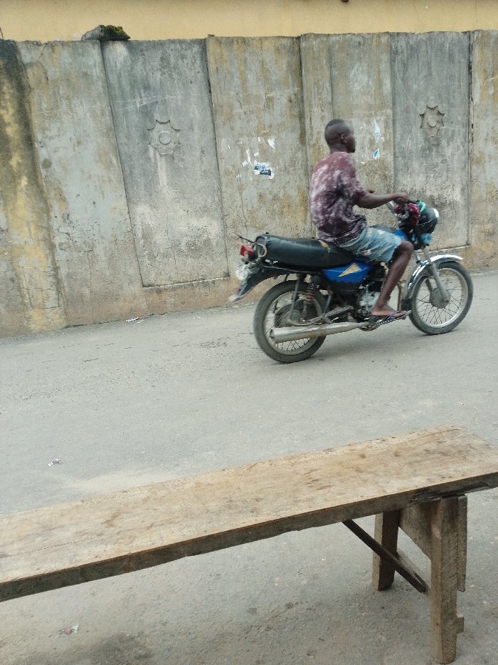 The image depicts an outdoor street scene in Agani, Nigeria. A dark-skinned male individual, wearing a reddish-purple patterned short-sleeved shirt and light blue patterned shorts, operates a motorcycle. He is seated on the black seat, holding the handlebars, with his bare feet on the foot pegs; a dark flip-flop is visible on his right foot. The motorcycle is a blue and black model with chrome handlebars and fenders, silver spoked wheels, and a visible exhaust pipe, positioned as if in motion from left to right across the frame. In the background, a weathered concrete wall features a repeating circular, star-like embossed pattern and remnants of faded paper or posters. Above the concrete wall, a plain yellowish-brown wall section is visible. The foreground is dominated by a rustic, weathered wooden bench with a plank top and visible support legs, partially obscuring the asphalt road surface. The road extends under the motorcycle and into the midground.
