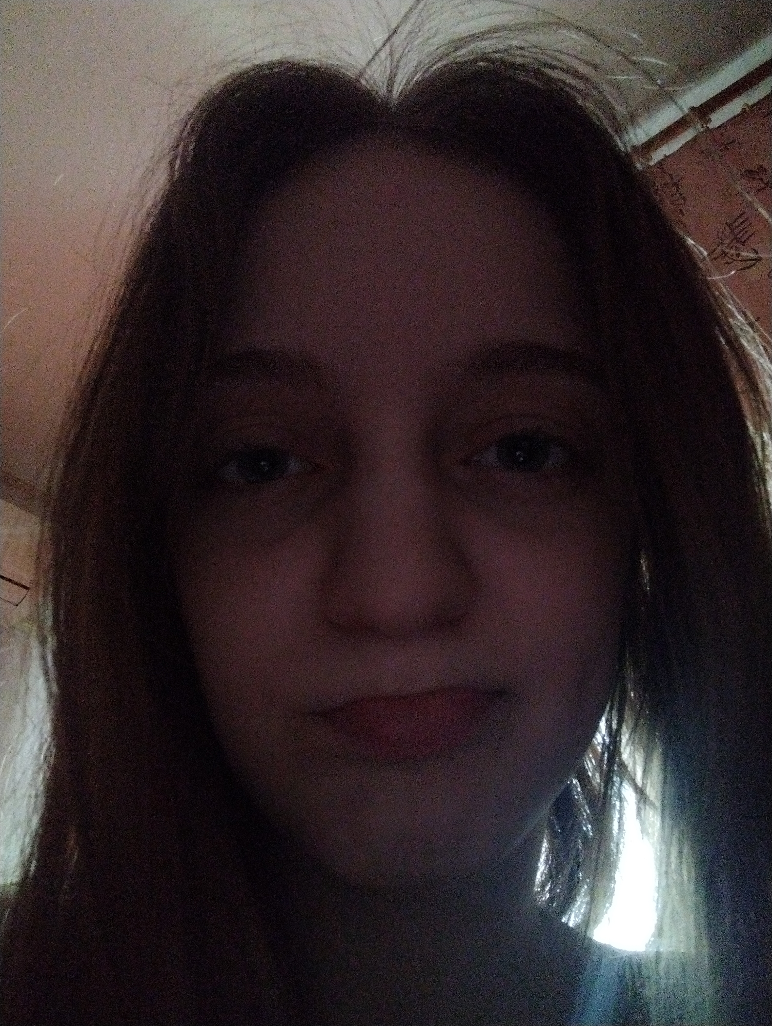 A medium-shot portrait of a young person with long, dark brown hair. The person's facial features are visible, including their eyes, nose, and mouth. The lighting is dim, creating shadows across the face. The background is blurred, with a glimpse of a wall with patterned wallpaper in the upper right corner. There is no information available to confirm the location of the photograph.