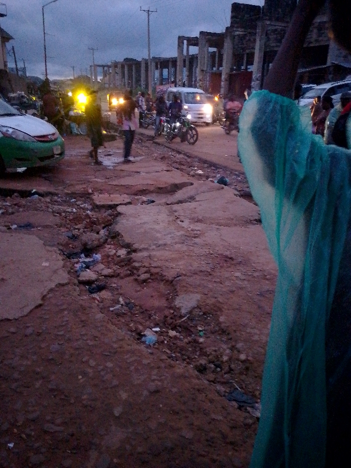 This image depicts a street scene at dusk in Nnobi, Nigeria, characterized by poor infrastructure and active pedestrian and vehicular movement